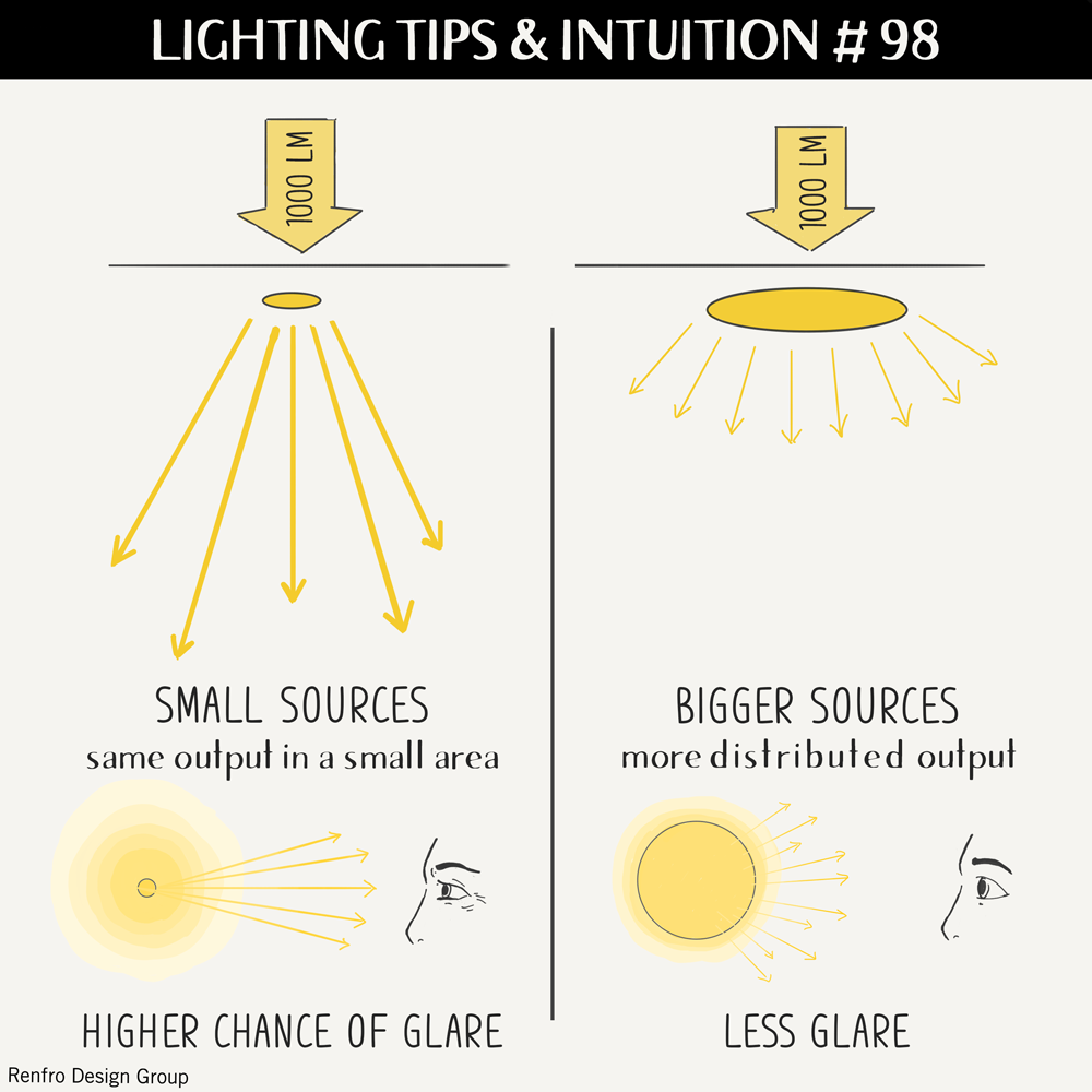 Glare of Lighting Sources Sep 17 Written By Richard Renfro Small light sources have a higher chance of glare, as opposed to the same output in a larger source of light. Back Lighting Intuition for Architects Richard Renfro